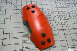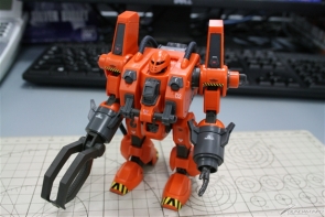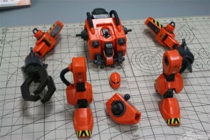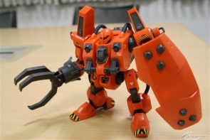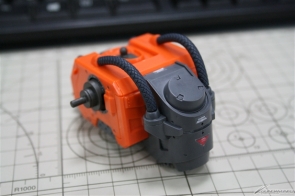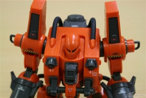 ▲まずは胴体と腰部から。背部の動力用融合炉と本体を繋ぐパイプは柔らかい合成ゴム素材でリアルに再現されている。