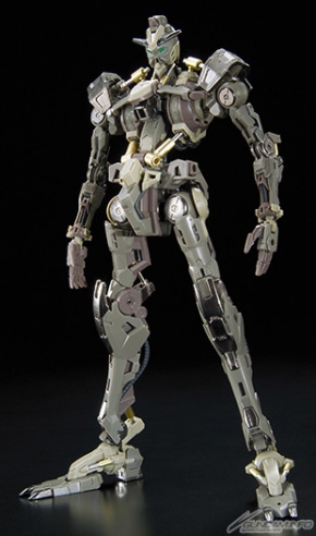 Its completed internal frame uses alloy parts for weight and realism. Mechanical details include functional piston-cylinder couplings. The seven included parts runners receive plating, metallic, pearlescent, and other coats to evoke a realistic feel. Along with its smoothbore cannon and sword, it also includes open-palmed manipulators for a variety of posing options.