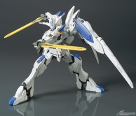 “GUNDAM BAEL,” the suit in which Agnika Kaieru’s soul dwells from Mobile Suit Gundam Iron-Blooded Orphans, has become a kit in the HG series. The proportions are an exact replicate of its size in the anime. It has a wide mobile range, allowing it to do elaborate poses including those with its weapon mounted. Its main armament, which can recreate its two-sword style, is also included.