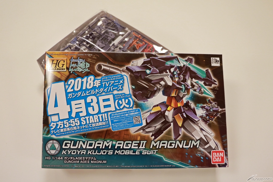\"HGBD 1/144 GUNDAM AGE II MAGNUM\", i Gunpla utilizzato da Kyoya Kujo e appare nella Compilazione di Gundam Divers Prologo, è ora in vendita davanti la sua trasmissione. La serie inizierà rispettivamente il 3 aprilerd (Mar) e andrà in onda ogni martedì alle ore 17:55 sulla rete di stazioni di TV Tokyo 6 e il 7 aprileth (Sab) ogni sabato alle 19:30 su BS11.