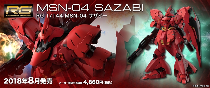 Il Sazabi RG mostra un trucco fatto di alta qualità scala 1/144, come la gimmick di mobilità presente le stesse pose del film, mentre l'apparecchiatura per i cilindri di braccio e imbuti sono anche fedelmente riprodotte. L'uscita è prevista per agosto, 4.860 yen (tasse incluse).