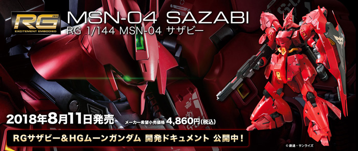 Sul sito Bandai Hobby, capitolo uno del "RG Sazabi & HGUC Luna Gundam sviluppo documenti" sono ora visibili. Informazioni sui dettagli ed espedienti, intervallo di movimento di spalle e braccia, e altri dati sono dati così andiamo Controllilo fuori.