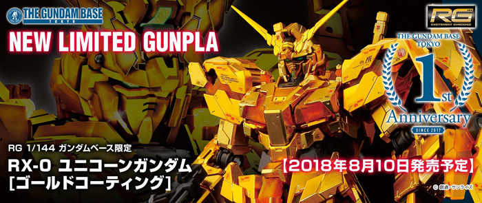 La Limited Edition Gundam Base Tokyo gunpla "RG RX-0 unicorn Gundam [Rivestimento in oro]" è stato rilasciato il 10 agosto, 2018 (Ven) a BASE di GUNDAM TOKYO situato al 7 ° piano di "Diver City Tokyo Plaza" in Odaiba, Tokyo. Prezzo è di ¥ 8,640 (IVA inc.)