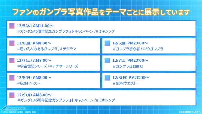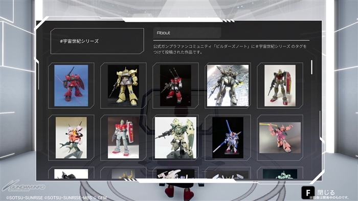 saranno anche mostrati in display in stile museale insieme alle foto pubblicate nella Nota del costruttore. Puoi anche reagire a ogni opera (ci sono un totale di oltre 1.000 opere!). La galleria fotografica espone innumerevoli foto di GUNPLA che cambieranno ogni giorno in base al tema della mostra.