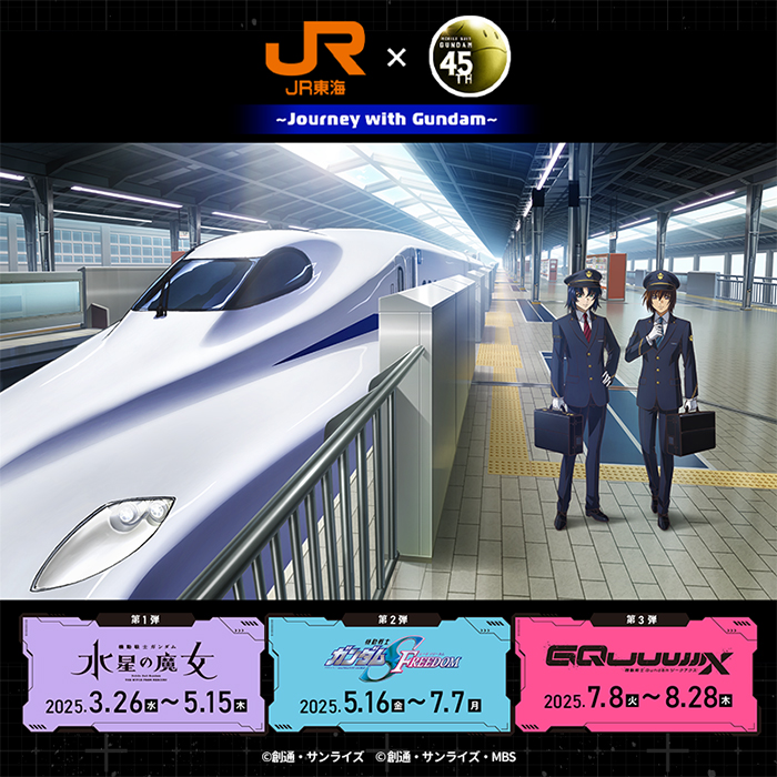 La serie Gundam festeggia il suo 45° anniversario e ora collabora con il Tokaido Shinkansen, che ha iniziato i servizi 60 anni fa. Durante l'evento, nel 2025 si terranno molti eventi di Gundam in giro per la città di Osaka e potrai goderti illustrazioni originali relative al Tokaido Shinkansen, programmi radiofonici speciali che possono essere ascoltati solo sul Tokaido Shinkansen, il rilascio di oggetti collaborativi e altre esperienze che possono essere vissute solo durante questo percorso.