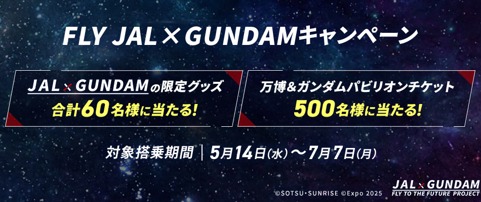 La campagna FLY JAL x GUNDAM, in cui un totale di 560 persone saranno selezionate tramite lotteria per vincere premi di lusso, è iniziata mercoledì 14 maggio.