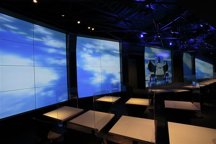 GUNDAM caffetteria zona ristorante è progettato per assomigliare a una mensa spazio corazzata.Un ampio display multi-monitor che misura in circa 18 metri di larghezza Mostra uno scenario spaziale fuori dalla nave, immerdendo i visitatori nel mondo di Gundam.
