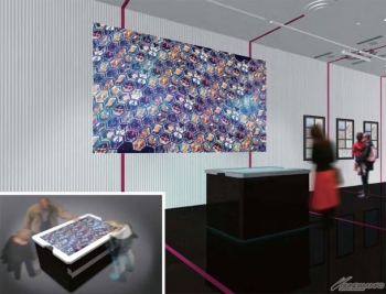 ガンダム全作品から主要な画像・キーワードを、タッチパネルで素早く、簡単に抽出できるテーブル型アーカイブマシン。その操作状況は壁面に大きく映し出され、周りのファンも一緒に楽しめる。直観的な操作が楽しいエンターテインメント情報端末となっている。