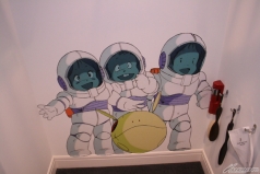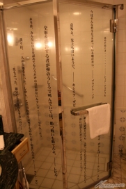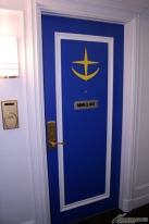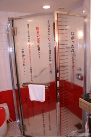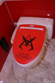 The bathroom and shower stall are decorated with quotes from Zeon luminaries like Char. The wall over the bathtub is painted with the Gogg and Char's Customize Z'gok.