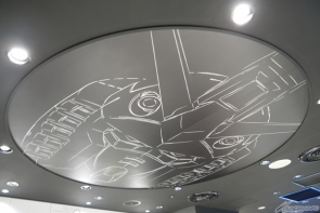 店内の壁には、安彦良和氏やことぶきつかさ氏のイラストが飾られているほか、天井に描かれた巨大なガンダムの顔や、随所に配置されたコーションマークになどガンダムファンには堪らない内装となっている。