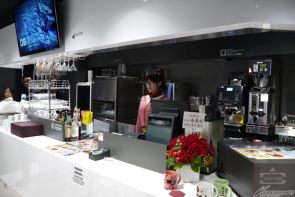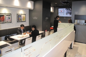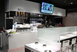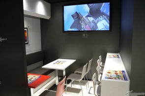 店内には26席のイートインスペースも設置され、最新ガンダムグッズなどのPV映像とともに食事を楽しむことができる。