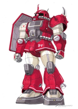 Based on the MS-06J Zaku II, this suit upgrades mobility and adds internal power ducts to the legs along with supplementary vernier thrusters.