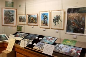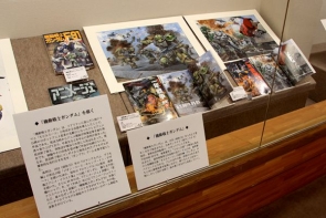 会場の1階には、髙荷氏の真骨頂であるミリタリーものを中心としたプラモデルのボックスアートや、学生時代のスケッチ画などが展示。そして、2階にはデビュー当時に描かれた少年雑誌の表紙や挿絵、新境地を開拓したTVアニメの雑誌の挿絵やプラモデル・ボックスアートが中心に展示されている。特に、ネジ一つまで正確に描くと評される髙荷氏の緻密なタッチで描かれた『機動戦士ガンダム』や「超時空要塞マクロス」、「装甲騎兵ボトムズ」、「戦闘メカ ザブングル」、「聖戦士ダンバイン」などのイラスト原画は迫力満点だ。