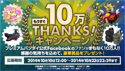バンダイ公式ショッピングサイト「プレミアムバンダイ」では、公式Facebookがまもなく10万「いいね!」になることを記念して、ガンダムシリーズや「宇宙戦艦ヤマト2199」などの人気アイテムが抽選で当たるキャンペーンがスタートした。