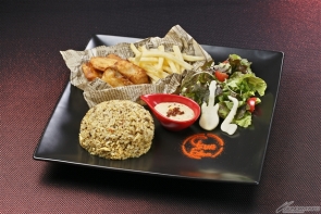 Zeon Deikun and his comrades dream of Spacenoid independence. This dish is modeled on selections from the menu of Club Eden, a hole-in-the-wall somewhere in the back alleys of the Republic of Munzo, where they gathered to debate politics long into the late hours of the night. ■ Creamy tartar sauce balances fish fritters and shoestring potatoes. A spicy dry curry completes the dish. |