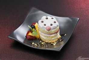 ■ A creamy layered cheesecake takes the shape of a full moon. Stacked crepes are layered like memories. Garnished with fruit.