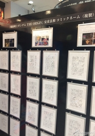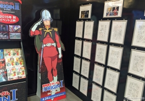 The shop features wall art including Char's Zaku and a life-sized Char Aznable himself, along with repro animation lineart and samples of Yoshikazu Yasuhiko's manuscripts for the comics and cover.