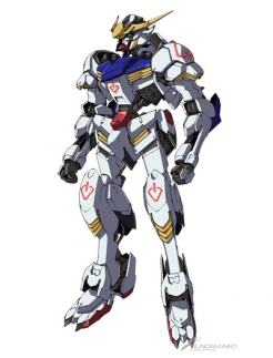 One of several “Gundam” frames which fought in the CALAMITY WAR three centuries prior, this suit has long since been retired to use as a generator by CGS. During the raid by Gjallarhorn, the boys of CGS hastily press it back into service, piloted by Mikazuki. Long years of poor maintenance since the CALAMITY WAR have left it with weakened armor and unable to operate at its full potential.