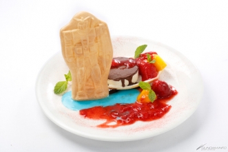 ■ガンプラ最中とフルーツソースのアイスプレート。ガンダムの後ろにはアイスが!マンゴー、イチゴなどフルーツもたっぷり!