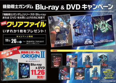 キャンペーン期間中は、本日発売の「機動戦士ガンダム THE ORIGIN II 哀しみのアルテイシア」をはじめとするガンダムシリーズのBlu-ray、またはDVDを対象店舗で購入すると、『機動戦士ガンダム THE ORIGIN』、『機動戦士ガンダム』、『機動戦士ガンダムUC』の特製クリアファイルが、いずれか1枚先着でプレゼントされる。