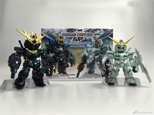 An exclusive Unicorn Gundam and Banshee FW Gundam Converge set is available overseas. Each features metallic paint, with the Unicorn Gundam's Psycoframe glimmering the brilliant green of its final battle.