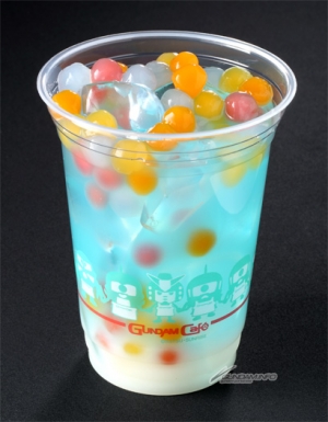本メニューは、『機動戦士ガンダム00』の主人公である刹那・F・セイエイのパイロットスーツをイメージした、青と白の爽やかなカラフルタピオカドリンク。