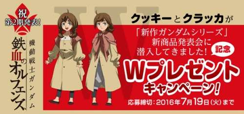 キャンペーンには2つのチャンスが用意されており、1stチャンスでは、ガンダムファンクラブ公式Twitter( @Gundam_FanC)をフォローしてキャンペーン告知ツイートをリツイートすると、「クッキー&クラッカ サイン入り HG ガンダムバルバトス第6形態」やガシャポンアイテム「どこでもオルフェンズ フルコンプ」などの『鉄血のオルフェンズ』グッズが7名にプレゼントされる。