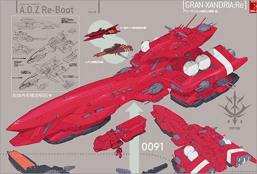 今回は、ホバーユニットの取り付け箇所や、ユニット離脱時の艦形状の変化などを図解するほか、アレキサンドリア級からアスワンを経て、グラン・ザンドレル級へと至る流れを系譜図で解説。また、レジオンとジオンマーズの組織や兵器に関する思想の違いなど、今後のストーリーに関わる部分も解説していく。