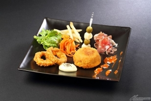 [Right] In the Back Alley the Eve of Battle ~Tomato & Basil Rice Croquette, Fried Calamari Rings, Dry-cured Ham, Olive & Cheese Pinchos~