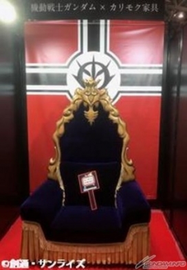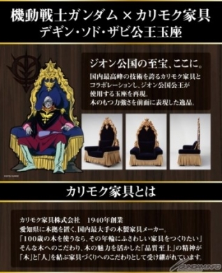 "Zabi Daimyo Throne" was a topic in collaboration with Bandai Life Division and Karimoku Furniture at "C3 AFA TOKYO 2017" held last August. The throne where Degwin Sodo Zabi was sitting in "Mobile Suit Gundam" is faithfully reproduced.