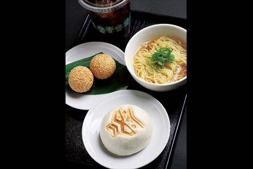 Set contents: meat bun (nikuman) / shiru soba / sesame dumplings / oolong tea
