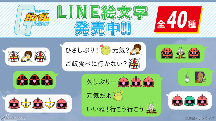La linea di Mobile Suit Gundam Emoji sono state soddisfatte con una distribuzione molto favorevole e possono essere trovati sull'immediata messaggistica app linea in-app store. Il prezzo è di 100 monete di linea (circa 240 yen con le tasse) per un insieme.