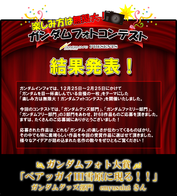 今回見事ガンダムフォト大賞に輝いたemyusalutさんへは、副賞としてガンダムインフォ秘蔵の「シャア専用カスタマイズキット付き[PIXUS MG7130]」を、また佳作の5名の方には、それぞれ1点ずつ「HGビルドファイターズシリーズ」のガンプラを進呈させていただきます。 ガンダムインフォでは、今後も様々な形で「ガンダム」をテーマにしたコンテストを開催していきたいと考えておりますので、今後もガンダムインフォをどうぞよろしくお願いいたします。 最後に今回ご参加頂いた皆様、ならびに審査員と告知にご協力いただきました「月刊ガンダムエース」編集部の方々、告知にご協力頂いた「電撃ホビーマガジン」、「月刊ホビージャパン」編集部の方々に、重ねて厚く御礼申し上げます。