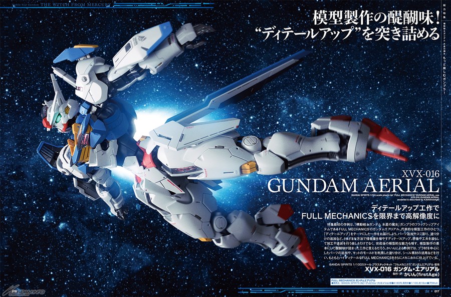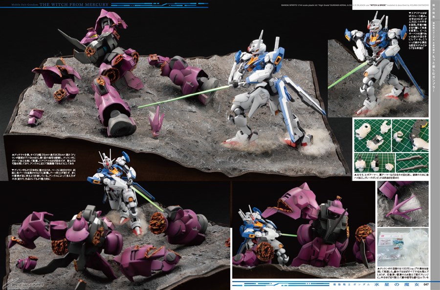 Inoltre, l'articolo include un diorama che riproduce scene famose della serie con la meccanica completa Gundam Aerial e la ricostruzione aerea di HG Gundam!