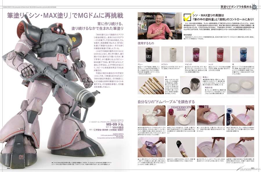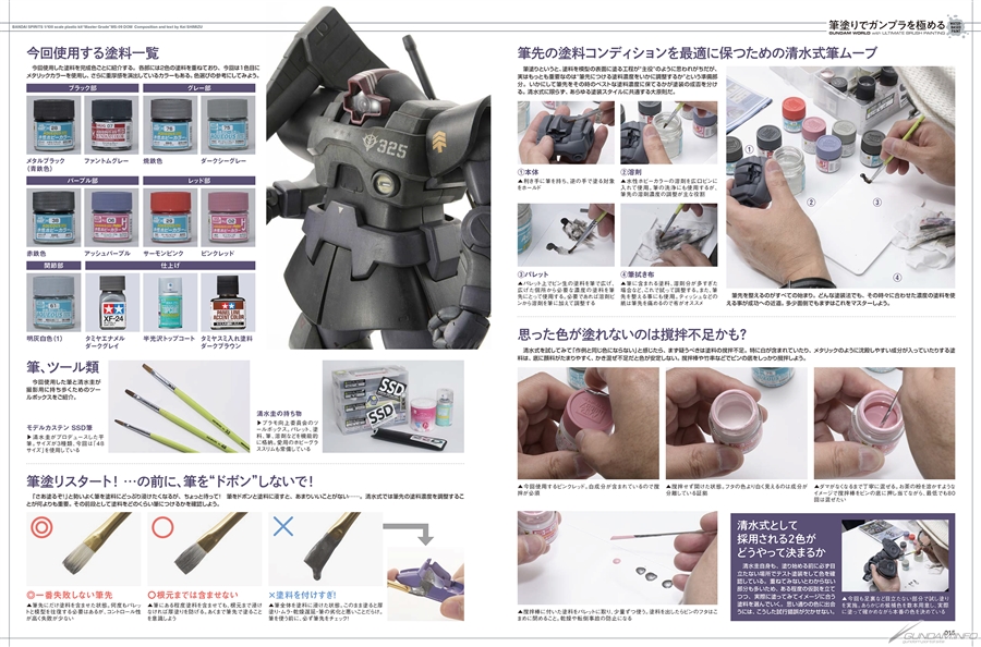 Questa sezione introduce varie tecniche di pittura a pennello, a partire dalla "pittura a pennello in stile Shimizu", il metodo di base della moderna pittura a pennello. Impara a scegliere i pennelli e a spennellare la vernice con le vernici laccate, oltre a tecniche avanzate di miscelazione e timbratura! Abbiamo preparato una guida che aiuterà tutti, dai principianti ai veterani, a iniziare con la pittura a pennello. Abbiamo anche incluso foto di esempi di creazione dei Triple Doms costruiti da modellisti professionisti specializzati nella pittura a pennello, come MAX Watanabe, Kei Shimizu e Seira-Masuo!