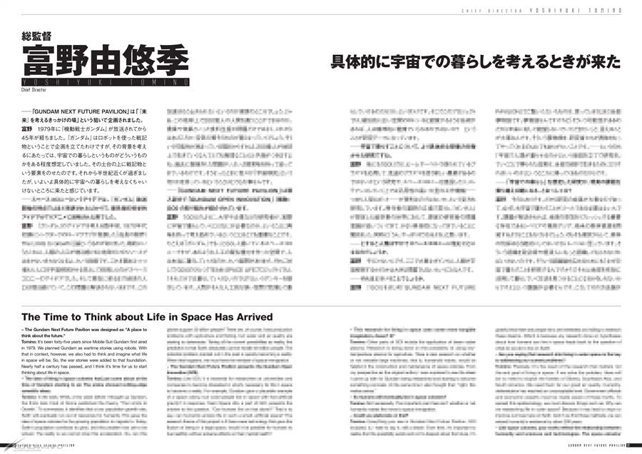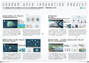 Oltre ai concept art per i mobile suit e gli sfondi che appaiono inGUNDAM: Il prossimo secolo universale, il libro include interviste con partner di co-creazione come esperti di vari settori, università, istituti di ricerca e aziende all'avanguardia di Gundam Open Innovation (GOI), che mostra i loro sforzi all'interno del padiglione.