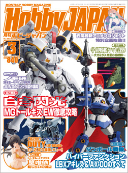 | Hobby Japan March issue On sale January 25th, 2013 Price: ¥840 <Cover model> LBX Achilles [Bandai 1/1] / Mitsu.Nagata OZ-00MS Tallgeese EW [Bandai 1/100] / Miyuki Uehara |