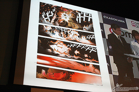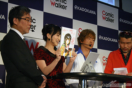 発表会では、株式会社KADOKAWAの代表取締役専務・井上伸一郎氏と、コミックウォーカー統括部長・古林英明氏、そしてアムロ・レイ役でおなじみの声優・古谷 徹氏と、「艦隊コレクション」で赤城役などを担当する声優・藤田 咲さんが登壇。