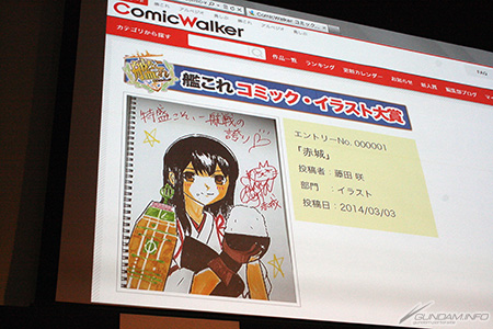 続いて投稿機能について説明が進むと藤田さんが登場。旧海軍の駆逐艦や巡洋艦を擬人化した「艦娘(かんむす)」たちを育てるブラウザゲーム「艦隊これくしょん-艦これ-」をテーマにした、ユーザー参加型新人賞「艦これ コミック・イラスト大賞」が開催されるということで、自身が演じる「赤城」の自筆イラストをお披露目。さっそく投稿機能を試してみるということで、携帯カメラでイラストを撮影。投稿作品第一号として登録された。