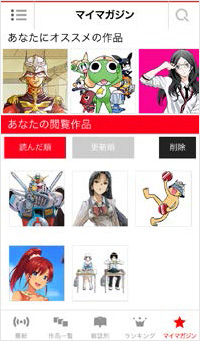 ユーザー独自のページが作成される「マイマガジン機能」では、読んでいる作品の更新情報を確認できるほか、閲覧履歴から類推されたオススメ作品が表示される。