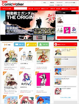 コミックウォーカーは、KADOKAWAが発行するマンガ雑誌とウェブマガジンで連載中の150作品に、完全オリジナル50作品を加えた計200タイトルのマンガが無料で読めるサービス。マンガ雑誌掲載時モノクロだった作品を最新の彩色技術でフルカラー化した作品もあり、第1弾として「機動戦士ガンダム THE ORIGIN」と「新世紀エヴァンゲリオン」が掲載される。