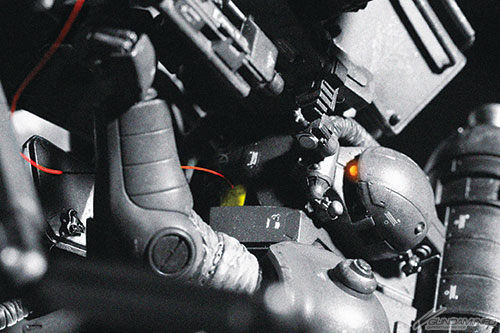 危険なサンダーボルト宙域に散らばり、孤独な戦いを続けるリビングデッド師団のスナイパー。彼らの日常を、記録映像風にとらえた本作は、『機動戦士ガンダム サンダーボルト』の作者、太田垣康男氏と、ホビージャパン誌ではモデラーとして初参加ながら、すでに模型各誌で活躍中のWildRiver荒川直人氏によるコラボレーションによって実現したものである。通常ディオラマといえば、先にモチーフとなる絵や映像が存在するが、今回は荒川氏によるディオラマ作品が先にあり、そこから得たイメージを元に太田垣氏が、見事なコマ運びで、作品の魅力を読者に伝えつつ、固定モデルとは思えないほど臨場感のあるビジュアルを作り出している。