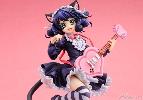 Debuting Cyan, the long awaited protagonist of the TV anime “SHOW BY ROCK!!”! The “live start” Cyan was lovely rendered in 3D. The motif is a Plasmagica illustration, in which she stands in a very cute pose. The amount of high points in it is incredible, with details such as the kitty ears, that she moves adorably in the show, the tail, the frills and ribbons, to the bell at the base of the neck. It’s actually a remedy to “Strawberry Heart” Mr. Berry’s fixation on playing guitar! The yaeba (protruding canine) charm point was also perfectly replicated, hence the figure perfectly cramming Cyan’s appeal.
