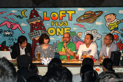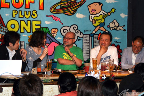Appearing from left to right are Miyuki Kishimoto, Ayumi Tsunematsu, director Kenichi Suzuki, director Kunihiro Mori, and producer Sato.