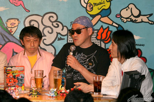 DVD-BOX発売の流れから「機動戦士SDガンダム」シリーズについての話になると、パロディから始まったSDガンダムが一人歩き始めて、どんどんわけのわからない世界へ入っていったこと、円柱なのに縦に転がるコロニーや、毎回スイカ割りを始める殺駆頭3兄弟といった、随所に織り交ぜられるシュールなギャグの誕生秘話がアミノ監督から語られた。