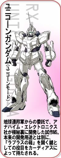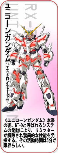 カーディアスが《ユニコーンガンダム》に組み込んだもうひとつのプラグラム。NT-Dが発動されるたびに、『ラプラスの箱』に関する情報が開示されていく。特定の座標での発動が条件となる。 |