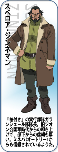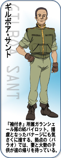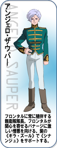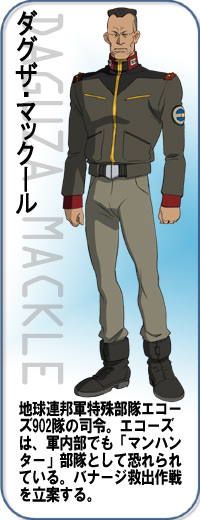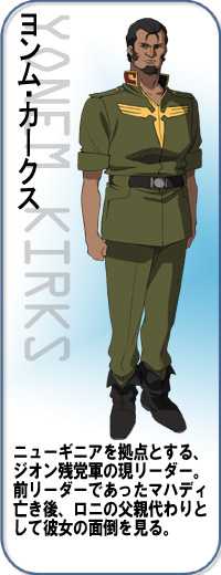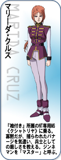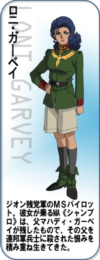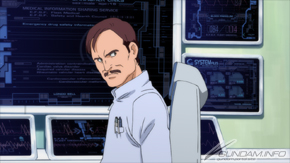 《ネェル・アーガマ》に乗務する医務官。『Zガンダム』で描かれるグリプス戦役時は《アーガマ》に乗艦、『ガンダムZZ』の第一次ネオ・ジオン戦争時から《ネェル・アーガマ》に乗艦するベテラン。 |
