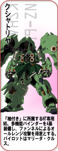 マリーダの本来の名は「プル・トゥウェルブ」。人工的に生みだされたニュータイプであり、12番目の試作品であった。第一次ネオ・ジオン戦争の最終決戦では、量産型キュベレイに搭乗した。 |