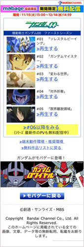 Bandai Channel and Mobage collaborate to bring Mobage members episodes 1-5 of Mobile Suit Gundam 00.
