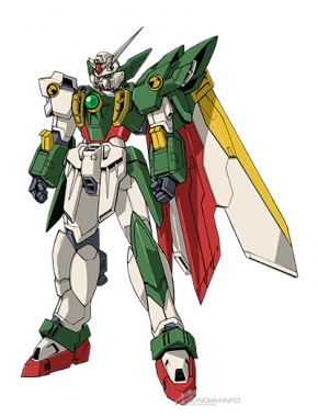 A unique, asymmetrical heavy modification of New Mobile Report Gundam Wing's Wing Gundam. The modifications include the removal of Bird Mode. The antenna and winglike "ear" on the right side of its head both bear scars of battle damage. |